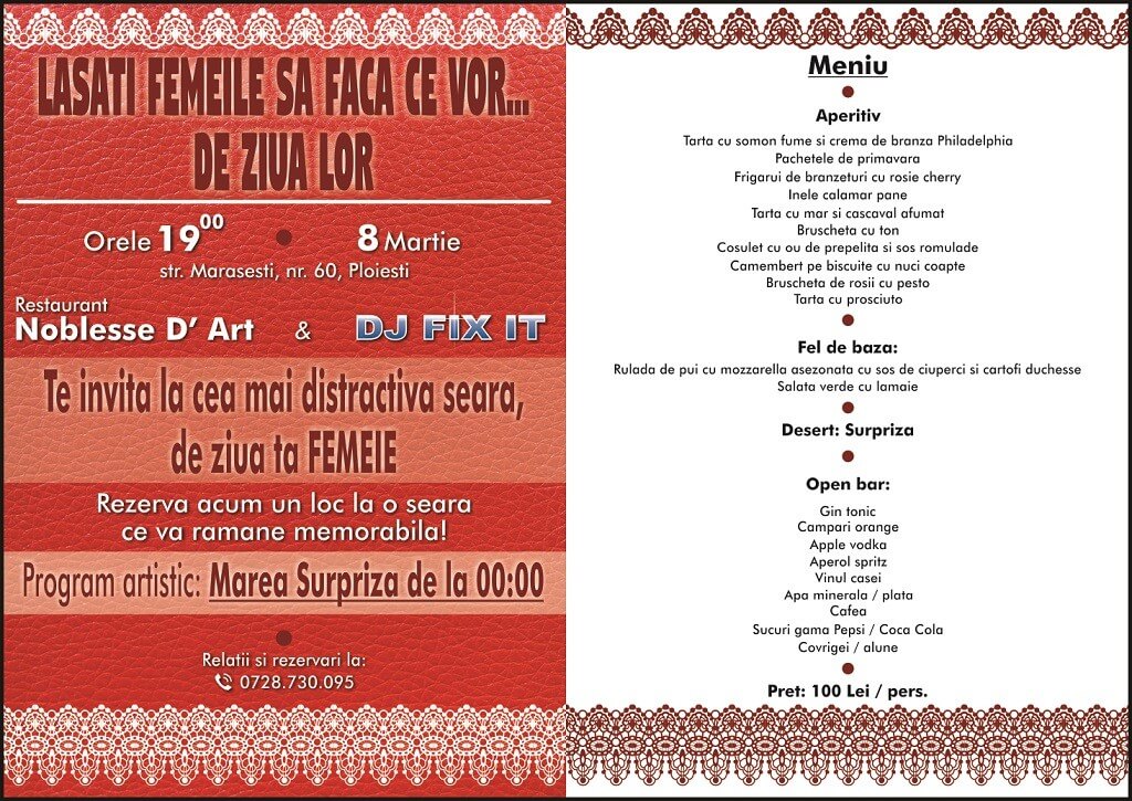 Se organizeaza evenimentul de 8 Martie 2017 la Restaurant Noblese D’Art la ora 19:00. Meniul pentru eveniment costa 100 ron per persoana. Rezervari la 0728.730.095. DJ […]